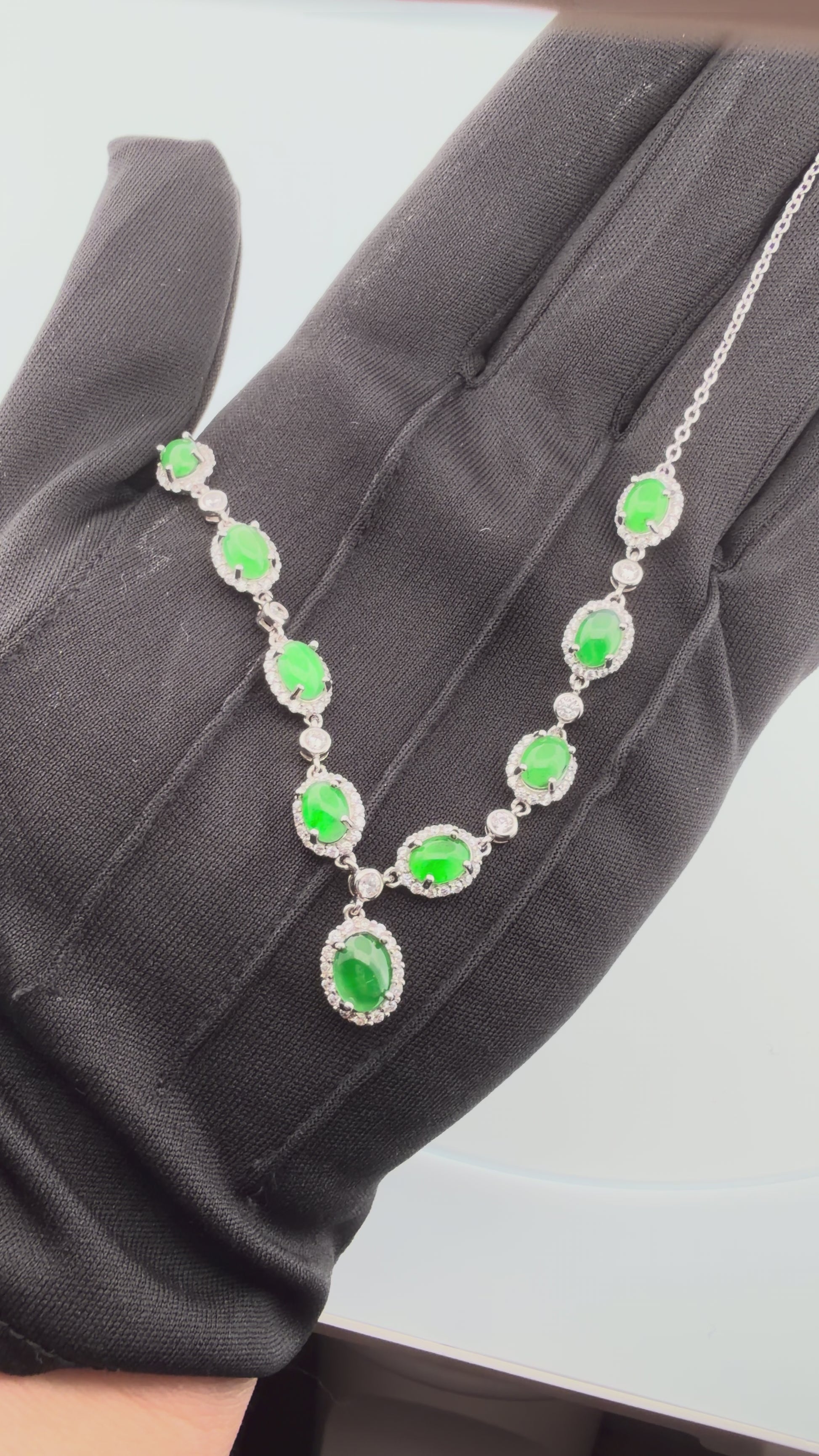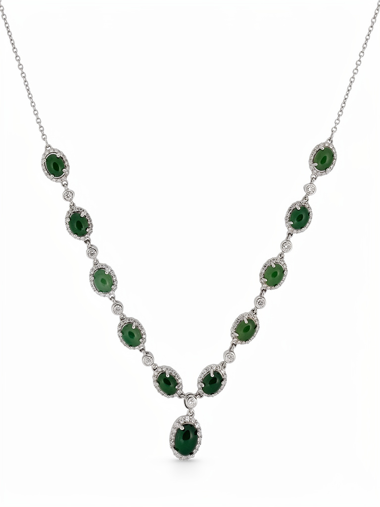A breathtaking blend of refinement and tradition, the Imperial Grace Necklace features a cascading line of rich green jade cabochons, each set in radiant S925 sterling silver and framed with shimmering zircon accents. The necklace forms a graceful V-shaped silhouette, enhancing the neckline with timeless sophistication and luminous beauty.